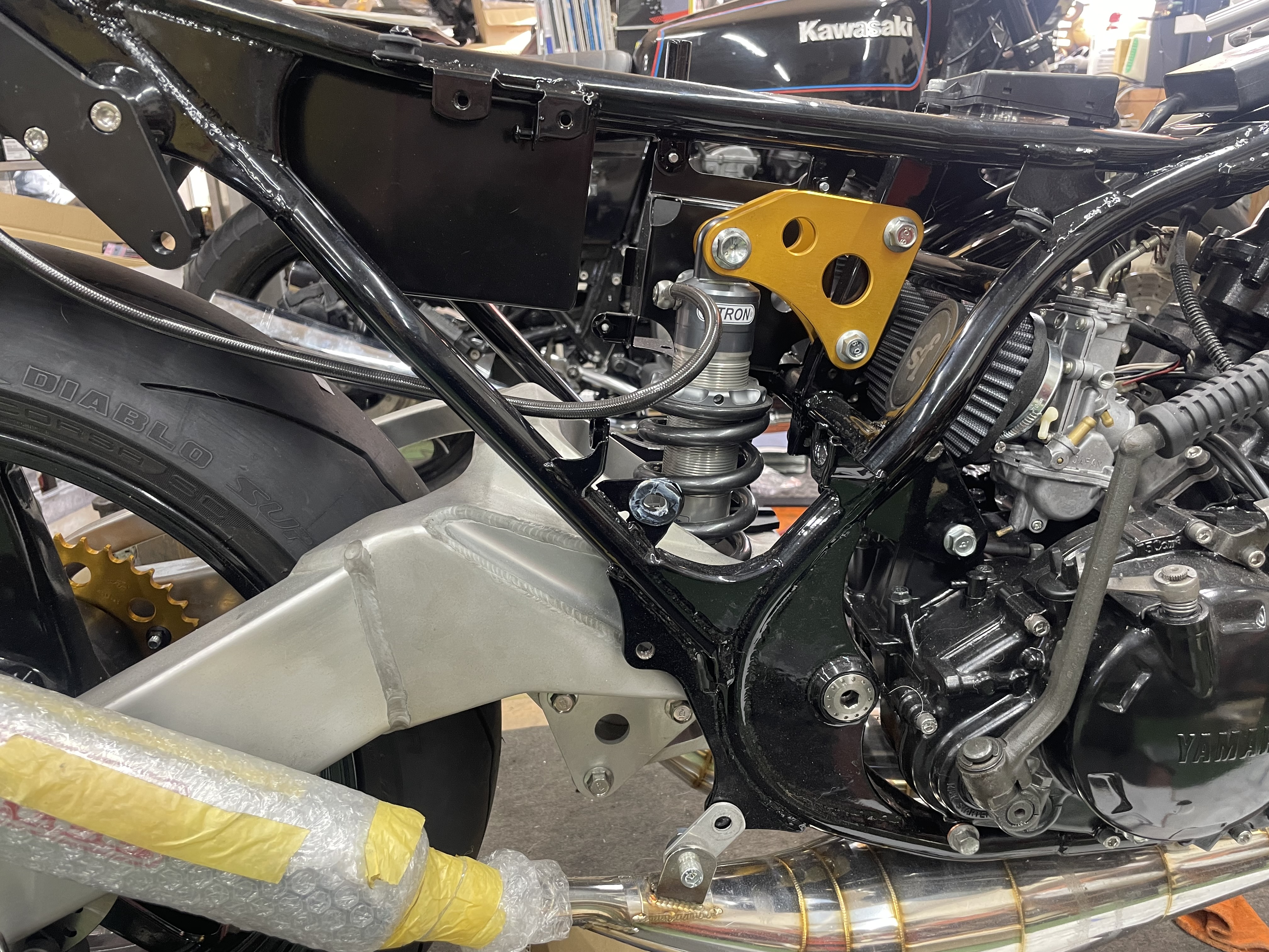 M様のZ2用に製作途中のスイングアーム。ベースはJ系の純正。 ノーマルっぽくありながら長さを確保した