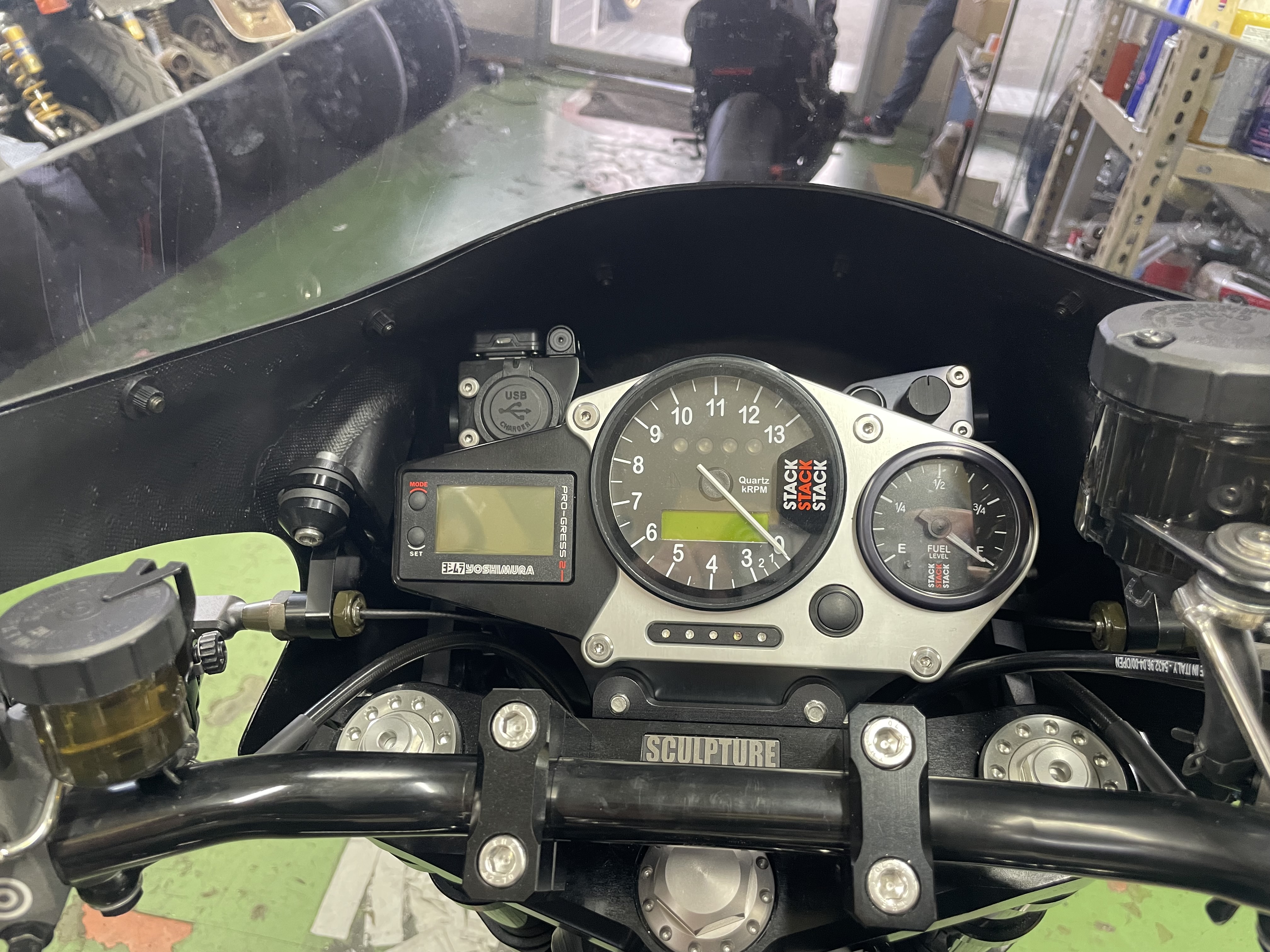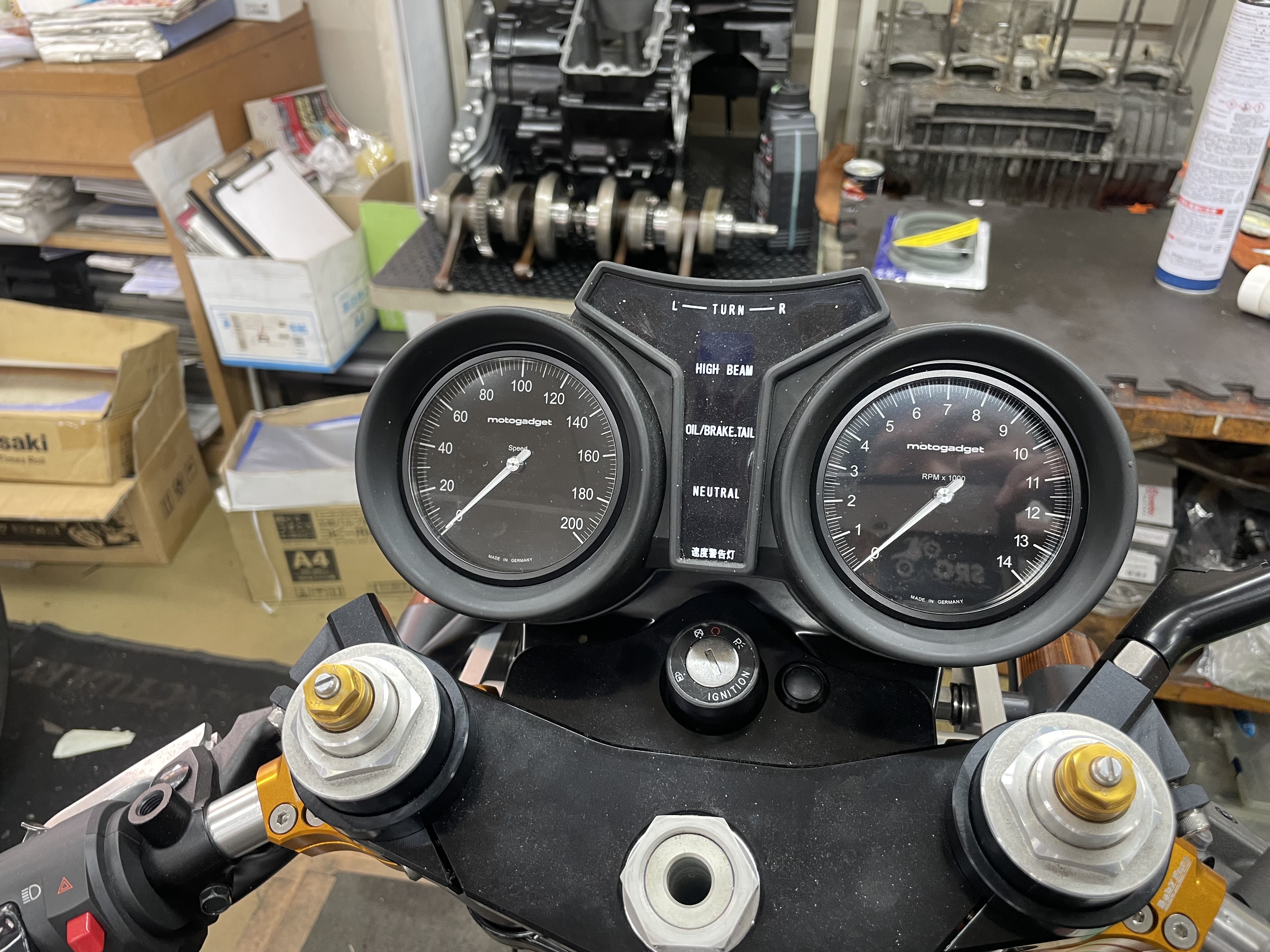 メーターパネル廻りなどワンオフで、メーターはSTACKインジケーターはモトガジェット。