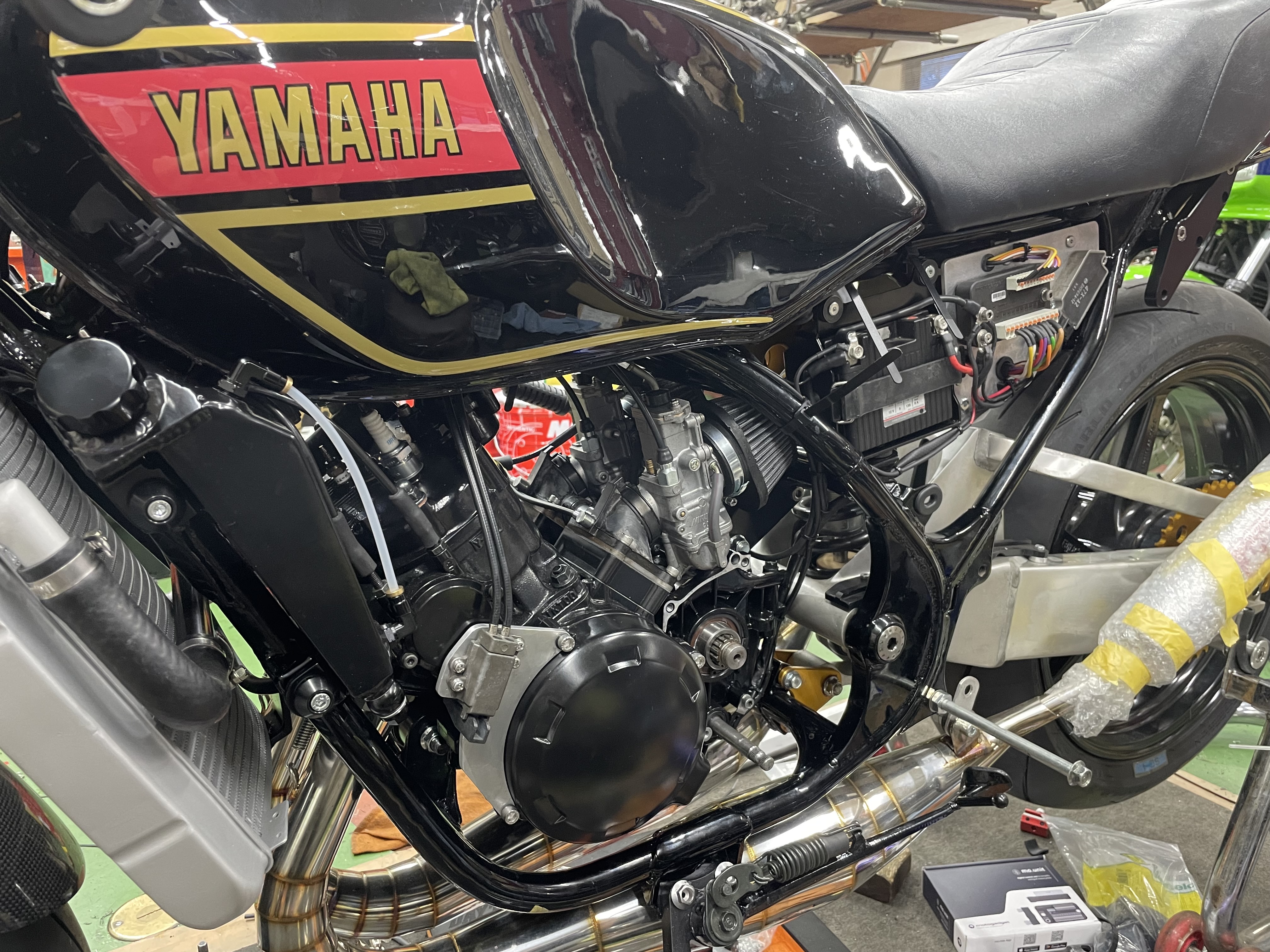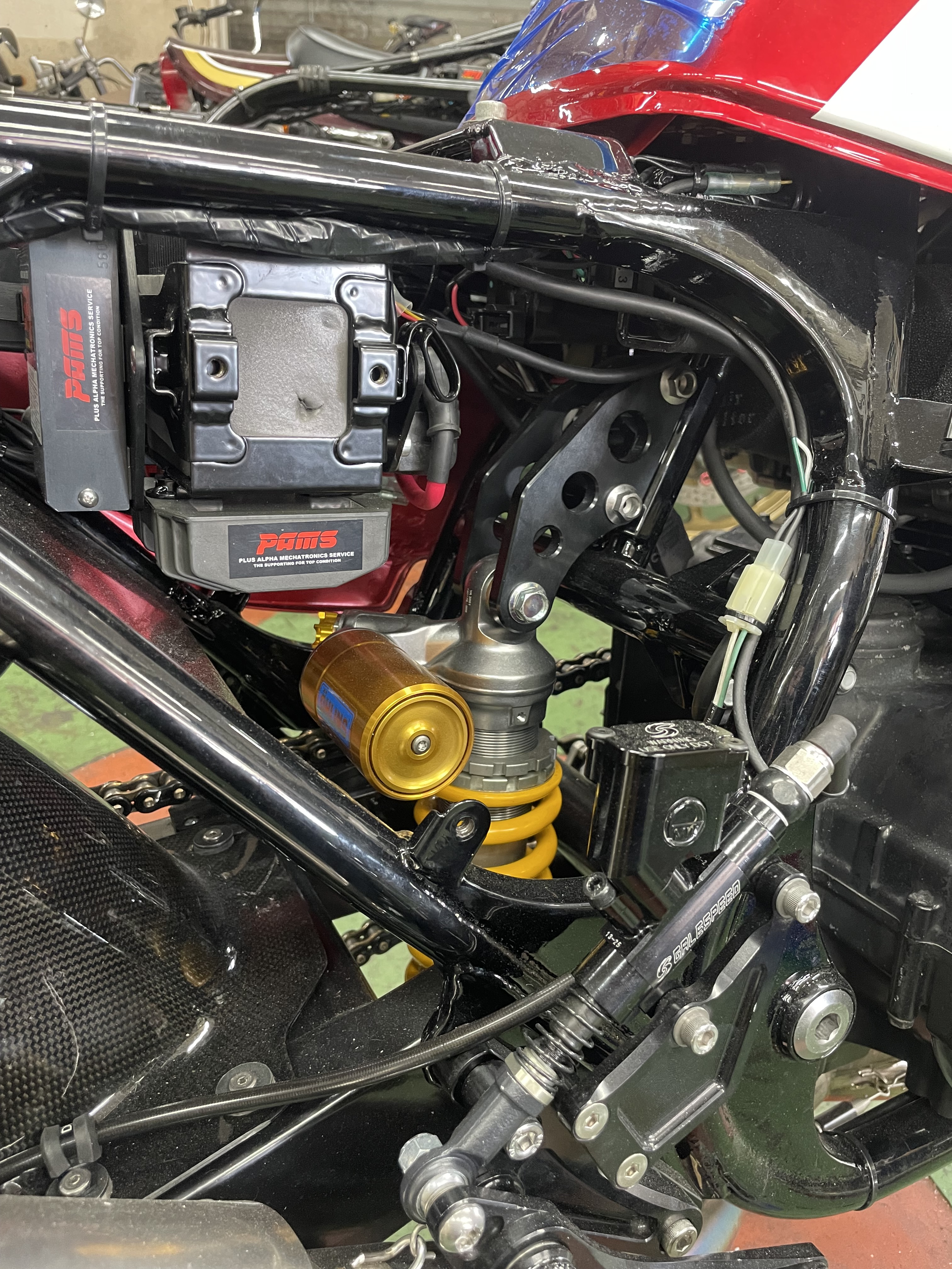 ・ナイトロチタンEX・ナイトロワイドラジエター&ハイマウントオイルクーラー・ナイトロサブフレーム・FCRφ37・OZピエガアルミ鍛造ホイル・ブレンボRCSブレーキ&クラッチマスター・オーリンズRサス・スイングアームスタビライザー取り付け&バフ・マジカルレーシングカーボンミラー・サンスターカスタムローター... など。